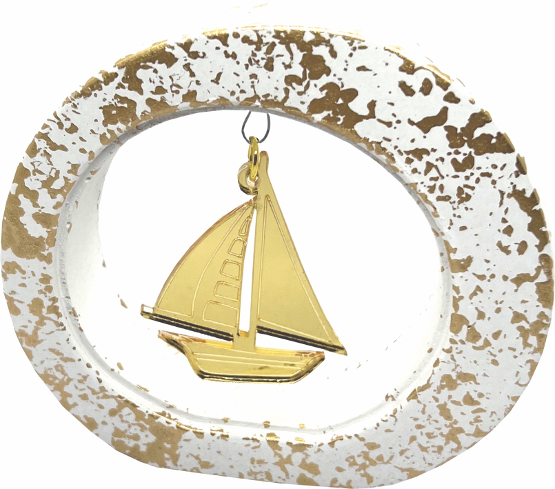Μπομπονιέρα κεραμικό με κρεμαστό Plexi Glass καραβάκι.
